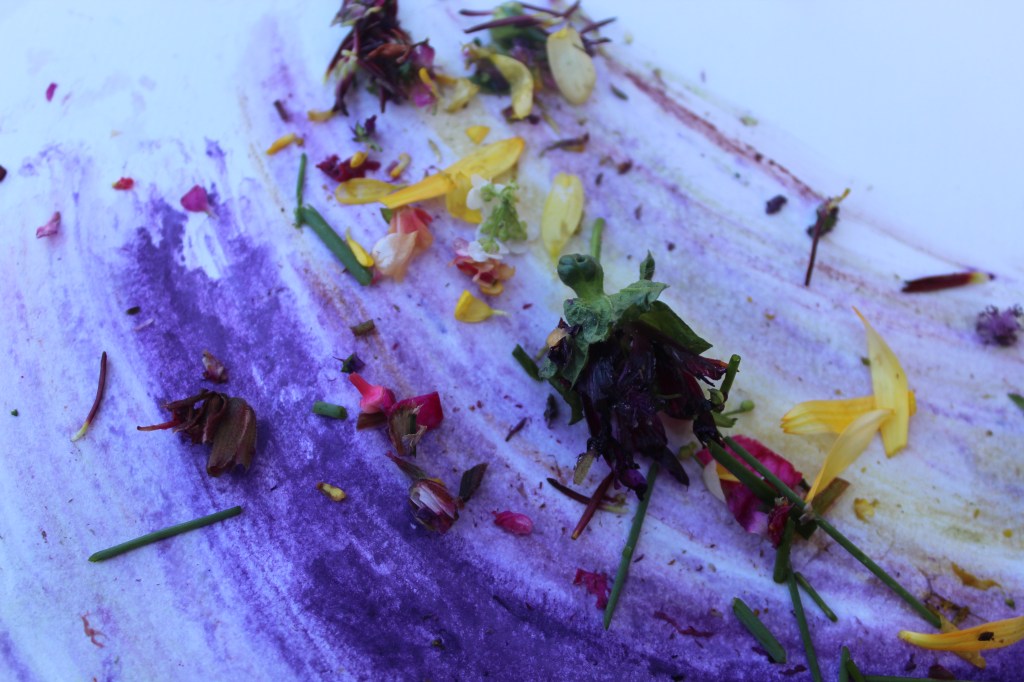 2. Using fingers press, mash and spread flowers into paper to see what colours the petals make.