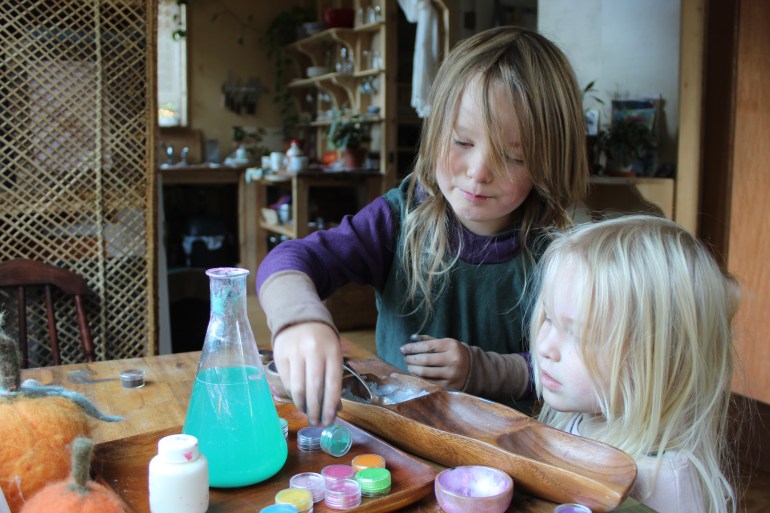 As the days grow shorter and the summer sun fades, we begin to look for a little sparkle to brighten the days. When I’m looking for sparkle, I always turn to magic. Potion play has become a bit of a tradition around here as we move towards Halloween and get into the witchy vibes by mixing up potions. Children love the messy fun of potion play and it’s a great way to introduce early science concepts through imaginative play. Intentionally mixing ingredients together calls us to observe reactions, and transformation. Smells, textures, and colours change through playful processes of mixing, and adding materials together.